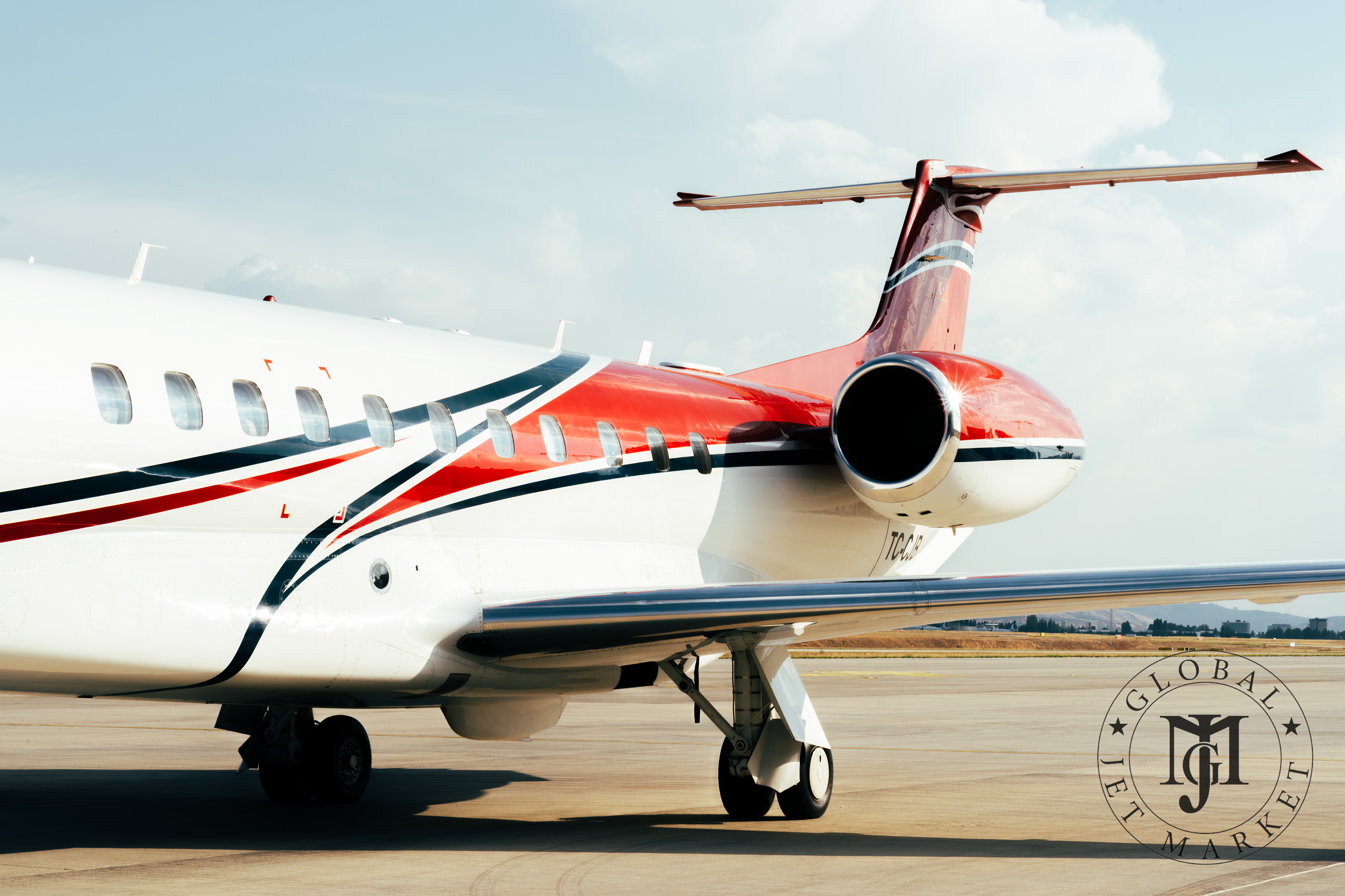 The striking red-and-white fuselage of the 2013 Embraer Legacy 600 and the sleek curves of its Rolls-Royce engines created a truly magnificent contrast with the natural sunlight.